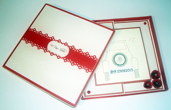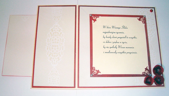 I tak w poniedziałek poleciałam najpierw do empiku po klej w taśmie (bo oczywiście mi się skończył w trakcie robienia pudelka do poprzedniej kartki) i po wstążki. A że było to również ćwierćwiecze Księcia Małżonka, to przecież musiałam zrobić coś dobrego, więc właściwie cały wieczór spędziłam w kuchni. Tu muszę się pochwalić, bo chyba pierwszy raz w życiu nic się ani troszkę nie przypiekło! Solenizant był zachwycony (a przynajmniej tak twierdził).