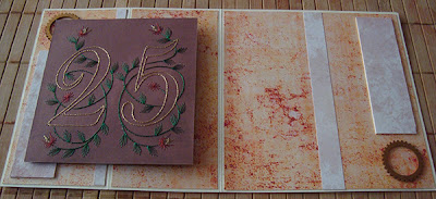 Jako że do zaoferowania mam właściwie tylko haft matematyczny, musiało to być coś wykonane tą techniką. Z drugiej strony ze steampunkiem kojarzą mi się tylko specyficzne ubrania i zębatki właśnie. Przez dwa tygodnie myślałam, jak to ugryźć, a dzień zero zbliżał się nieubłaganie. W pewnym momencie zorientowałam się, ile lat kończy i wpadłam na pomysł, który ostatecznie wykorzystałam na kartce. Nie jestem pewna, czy jeszcze kiedyś powtórzę coś podobnego, bo okazało się, że ilość dziurek była podobna w tej kartce z różą. A do tego w międzyczasie złamała mi się igła i musiałam dokańczać dziurkowanie starym sposobem, czyli pinezką do tablic korkowych. Nie wiem, jakim cudem kiedyś wydziubałam tym sposobem zaproszenia na ślub...