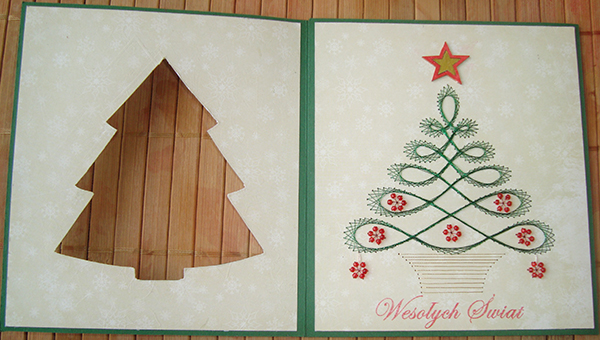 To już chyba ostatni raz przed Wigilią, kiedy mam okazję korzystać z komputera. To też ostatnia kartka, którą wysłałam do kogoś, kto tutaj nie bywa, a więc ostatnia, jaką mogę pokazać, zanim dostanę informację, że przesyłki dotarły do adresatów. Nie, żeby było ich dużo, bo łącznie wysłałam sześć kartek, ale to wystarczyło, żebym miała dość do następnej zimy. A to wszystko dlatego, że nawet jak się już rozsiądę z papierkami i wzorami do haftu miesiąc wcześniej, to natchnienie spływa na mnie i tak dopiero w ostatniej chwili. A tu jeszcze pieczenie, zmiana dekoracji z jesiennych na zimowe (nie obchodzę Świąt, więc u mnie wszystko ma związek z porami roku) i mycie okien. Z tym ostatnim co prawda załapałam się na kilka ciepłych dni i obskoczyłam całe mieszkanie, ale nie dałam rady wyprać zasłon z salonu, bo... wysiadła pralka. Na szczęście okazało się, że to tylko panel kontrolny się obluzował i Książę Małżonek naprawił, ale przez chwilę miałam upiorną wizję kupowania nowej maszyny. A akurat pralka spisywała się nieźle, w przeciwieństwie do zmywarki, którą chcemy wymienić jak najszybciej, ale ona, jak na złość nie chce się zepsuć.