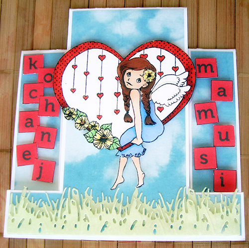 Jak tylko zaczęłam myśleć o kartce na Dzień Matki, od razu przypomniałam sobie o tym stemplu. Co prawda jest chyba walentynkowy, ale w końcu dzisiaj też jest święto miłości.