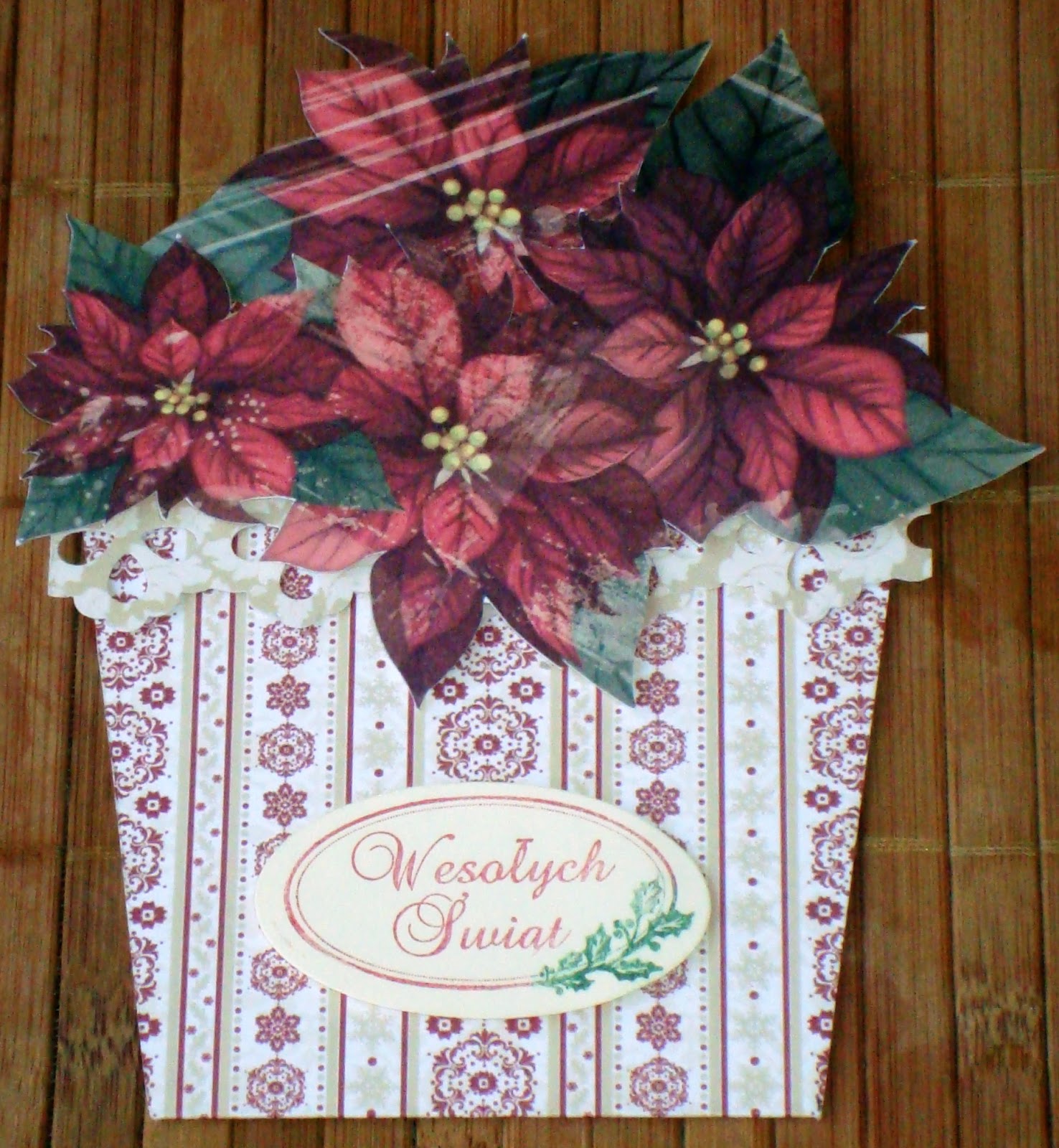 To już ostatnia tegoroczna kartka świąteczna. Przynajmniej jeśli chodzi o te, które udało mi się sfotografować, robione na ostatnią chwilę (sześć kartek w dwa dni to dla mnie nie byle jakie osiągnięcie). Były jeszcze dwie, które zrobiłam w miarę na czas, ale jeszcze w czasie trwania zajęć na uczelni, więc nie miałam jak zrobić im zdjęć (wracałam do domu, jak już było za ciemno, a chciałam je wysłać jak najszybciej).